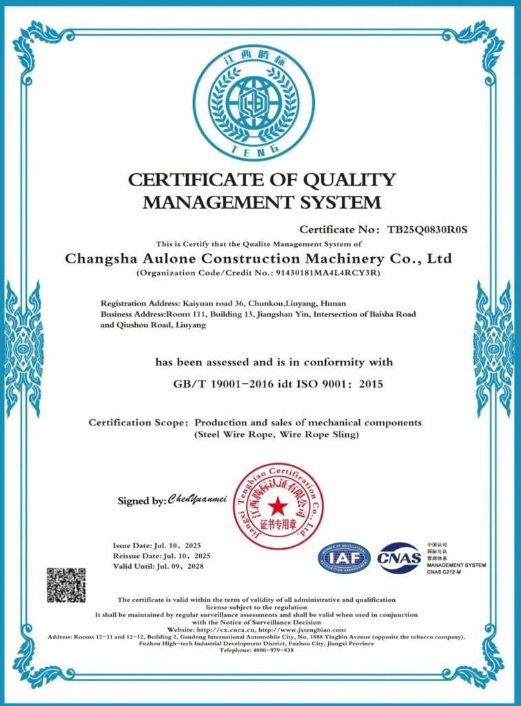 Aulone delivers BV,DNV, ABS, RMRS, ISO 9001 , CE certified wire ropes built to EN standards, trusted in mining, marine, and construction projects worldwide.