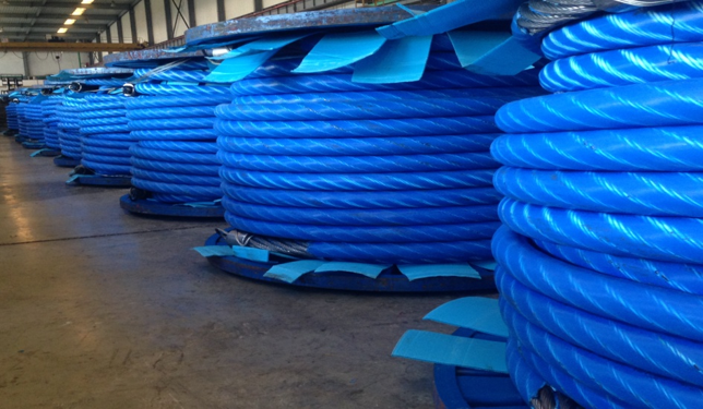 The plastic coating is applied over the finished rope to protect the steel from abrasion, dirt ingress, and corrosion while improving safety and handling.